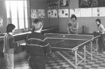 | Le club de tennis de table de Biozat existe officiellement pour la fédération depuis 1984, mais des pongistes amateurs s'exerçaient déjà dans le village. Ressuscitée sur l'initiative du directeur de l'école publique Jacques PENNETIER, l'Amicale Laïque de Biozat, créée avant-guerre, dépose à nouveau ses statuts en préfecture en Avril 1984. Le but de cette association est d'animer le village. La section tennis de table qui en est en grande partie à l'origine, s'y rattache naturellement. Au départ, les conditions de jeu sont spartiates puisque le club ne peut installer qu'une seule table dans la cantine de l'école (voir photo). Rapidement, le club investit la grange communale encore en chantier, ce qui vaudra quelques chaleureuses rencontres, disputées avec blouson, parka, bonnet et gants (il n'y a pas de photos et c'est bien dommage...), certains anciens s'en souviennent... Grâce à l'implication de l'instituteur , les enfants de l'école participent activement à la section et aux compétitions organisés par l'UFOLEP. Plusieurs titres départementaux UFOLEP viendront remplir les premières étagères de la salle des trophées... Les adultes se prennent aussi au jeu et finissent par s'affilier à la FFTT et participer au championnat par équipes. Au bout de 3 saisons, le club accède à la régionale 3 (il faut dire que le championnat départemental ne comporte que deux poules...). Les meilleurs joueurs, Laurent CHABRIER, Jean-Marc PENNETIER, Gilles LOPEZ obtiennent à titre individuel les meilleurs classements du club (45). | ![]() |